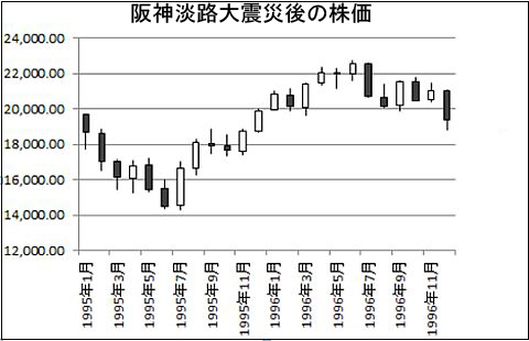 阪神・淡路大震災の時は、円高による不況が重なったために、株価は大きく下げ、回復基調まで半年かかったな。1月に震災が起きてから、7月に最安値となり、その後、半年かけて元の株価水準(19,000~20,000円台)に戻ったんや。