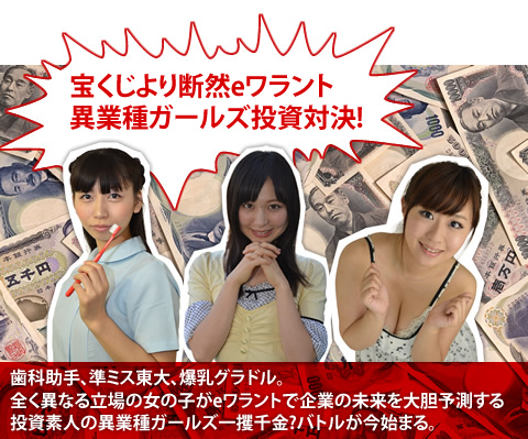 投資経験ゼロの女の子たちが、企業の未来を投資商品価格のアゲサゲで占います。アゲサゲ判定ツールとして使うのはeワラント。宝くじを買う程度のお金ではじめられ、株や先物、株価指数など数多の金融商品を対象に上げ下げを予想するシンプルでエキサイティングな投資商品なのです。