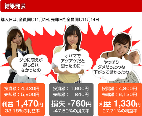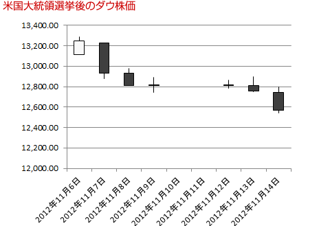 オバマ候補対ロムニー候補の大統領選挙!選挙はオバマ候補の勝利に終わったものの株価は下がった。素人娘のクールな見方に、女は怖いと思ったわ。ワシも投資する前に女房に意見を聞くようにしよう。