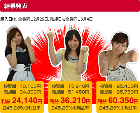 たまちゃんは、自信があったようでドーンと25,400円を投資したら利益が60,350円や。