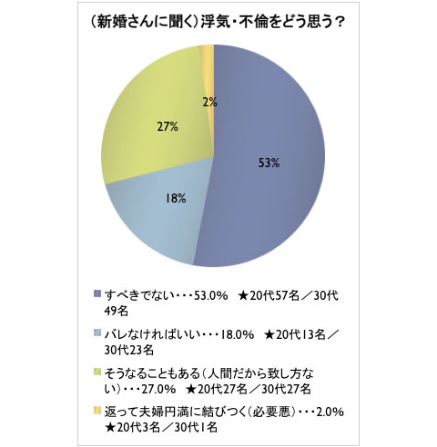 今回の調査と前回の調査を比較すると、例えば新婚時には「すべきでない」が53.0%あったが、年数が経つと38.2%に下がってくることがわかる。「そうなることもある(人間だから致し方ない)」は新婚時には27.0%しかなかったが、年数が経つと42.4%に上がっていることがわかる。つまり、結婚後、年数が経つほどに浮気・不倫を許容するようになってくるというわけだ。これは実際、世の中に(自分の身の回りに)浮気・不倫が多いという現実を表していると言えるだろう。