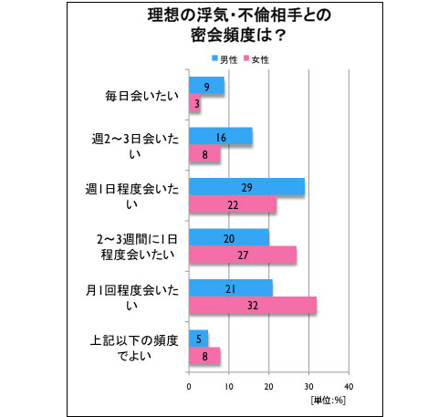 「どれくらいの頻度で、浮気・不倫デートをしたいか?」という質問であるが、特徴的なのは、女性の方が「それほど頻繁に会わなくてもよい」と考えていることであろう。男性の最多は「週1日程度会いたい」であり、女性の最多は「月1回程度会いたい」である。全体的にも女性の方が頻度の少ない方に回答が振られているようだ。