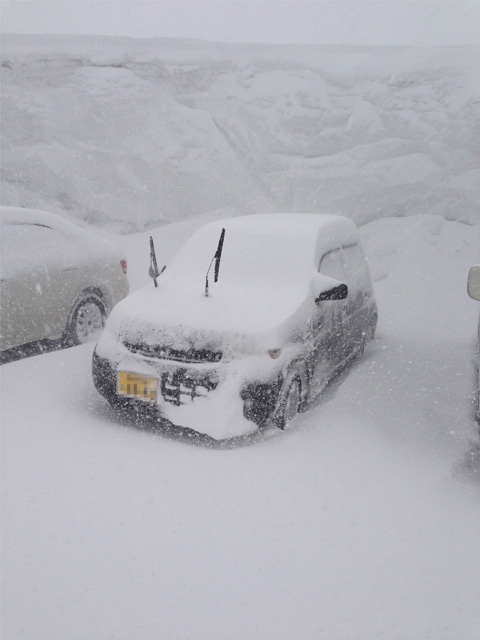 行って戻ってきただけなのに、車にはすでに雪が積ってる……。ワイパーをあげているのは凍らせないためだとか。ワロタ。
